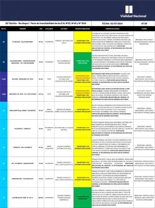 Por otra parte, en la Ruta 23, se registraron fuertes nevadas en la jornada del lunes que continúan este martes. Ante eso, la ruta se encuentra «transitable con extrema precaución» entre Dina Huapi y Los Menucos.