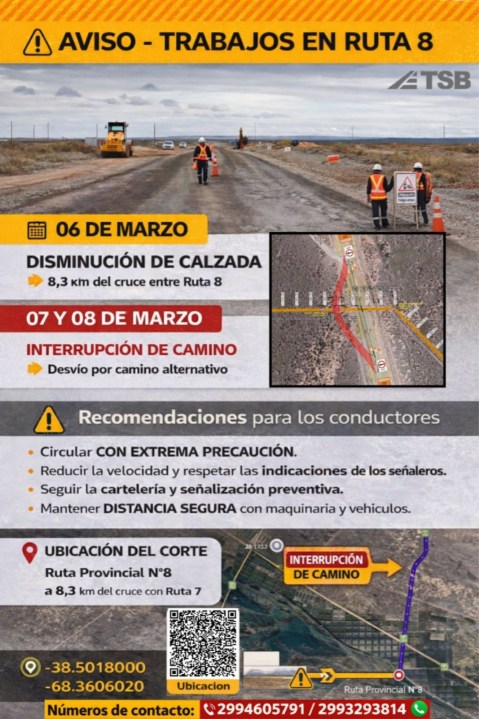 Durante este fin de semana, sábado 7 y domingo 8 de marzo, la Ruta Provincial 8 se encontrará en obras. Debido a esta situación se prevén restricciones que afectarán el tránsito normal de Vaca Muerta. Solicitan circular con extrema precaución por la zona y respetar las señales de desvíos.