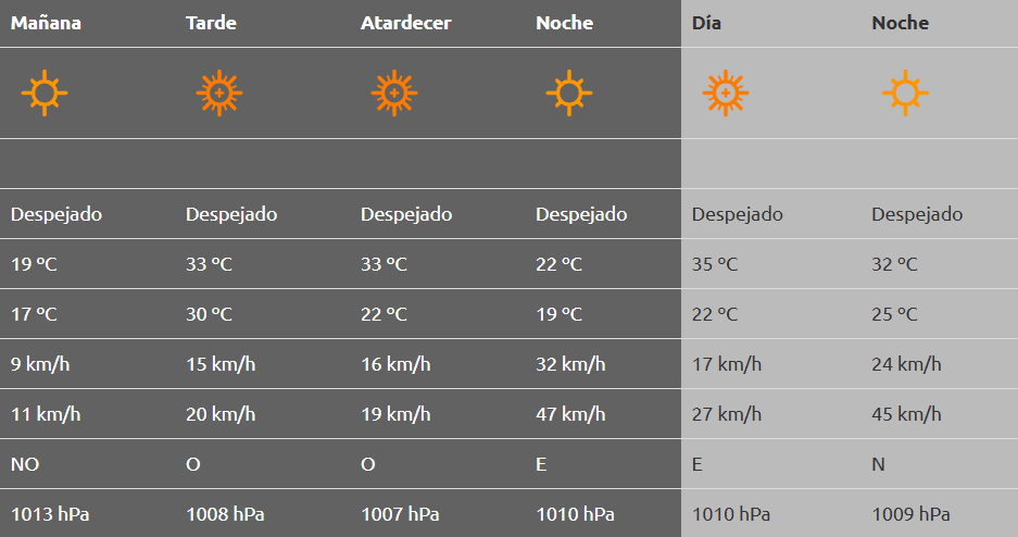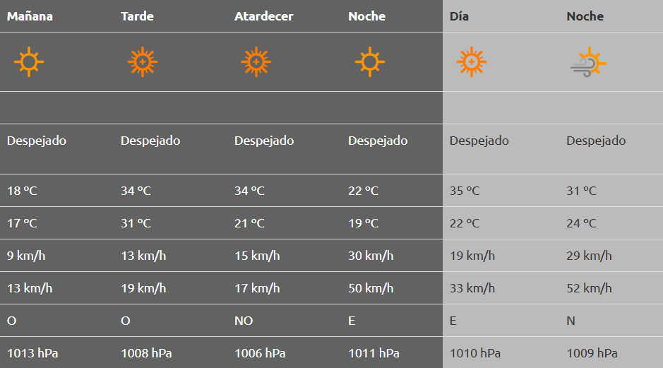 A su vez, se aguarda un día absolutamente despejado y con una leve brisa que, por la noche, aumentará su incidencia desde el este llegando a 37 km/h, con ráfagas de 47 km/h.