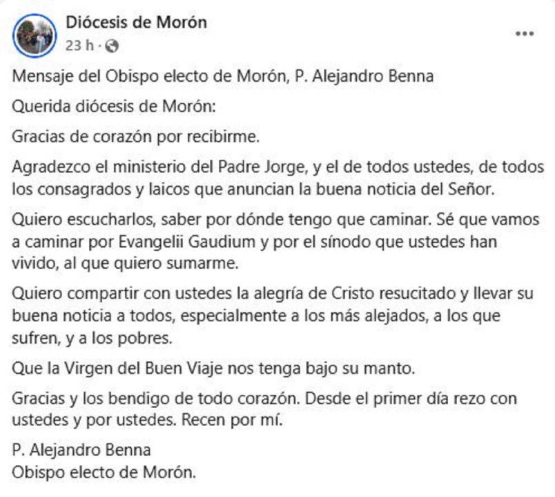Anticiparon cuándo será la despedida del Obispo Benna | Agradecer lo compartido