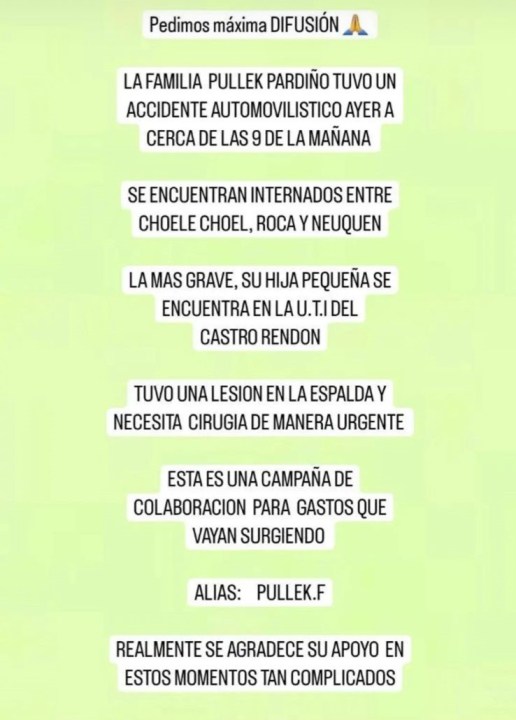 Para colaborar con la familia se debe enviar dinero al alias: Pullek.F