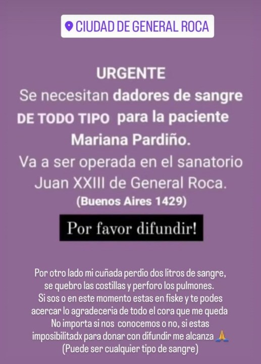 Por otro lado, los familiares pidieron dadores de sangre de todo tipo para la mujer que se encuentra internada en el sanatorio de Roca. «Perdió dos litros de sangre, se quebró las costillas y perforó los pulmones», explicaron en el comunicado.