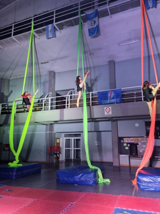 A su vez, en 2013, sumaron otro espacio: el gimnasio de la Escuela Nº 2, donde el coordinador Nelson Carmona les abrió la puerta para incorporar actividades. El salón era muy alto y eso trajo consigo una nueva idea: telas acrobáticas, un salto creativo que enriqueció aún más su propuesta.