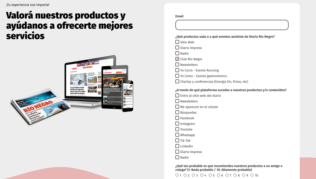 En diario RÍO NEGRO tu experiencia nos importa y por eso te invitamos a que completes una breve encuesta para que nos cuentes qué pensás de nuestros productos. Queremos ofrecerte el mejor servicio y tu opinión es clave para optimizarlos.