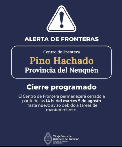Desde el complejo fronterizo Pino Hachado anunciaron la suspensión de su funcionamiento a partir de este martes 5 de agosto. Se trata de una medida por tareas de mantenimiento que se realizarán en las instalaciones. Este jueves el paso se habilitó.