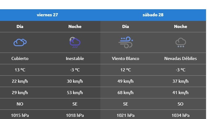 Vale recordar que para la cordillera rionegrina y neuquina rige una alerta por nevadas intensas este viernes, que también se repetirá el sábado del lado de Neuquén.