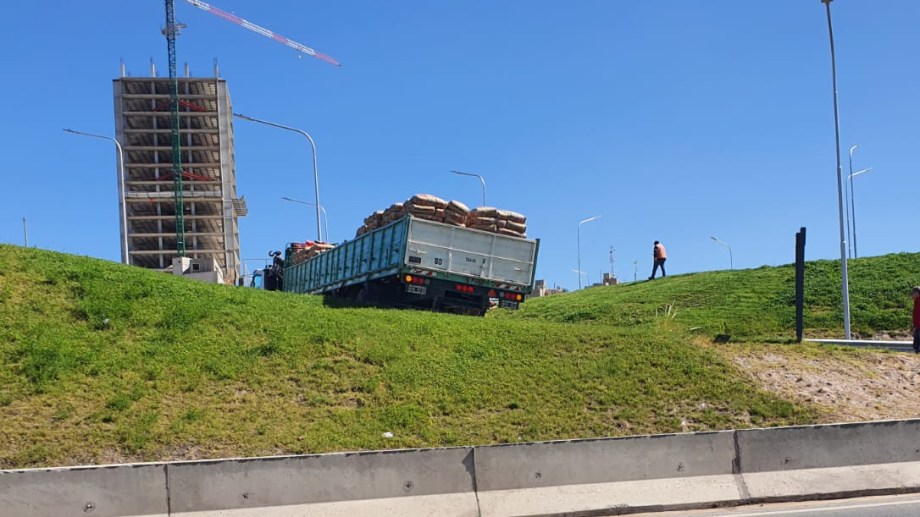 Un camión cargado con bolsas de cemento intentó subir por el rulo del Nodo Vial que conecta la Avenida Raúl Alfonsín con la calle Doctor Ramón, pero el peso del cargamento le impidió continuar con el ascenso y quedó atascado.