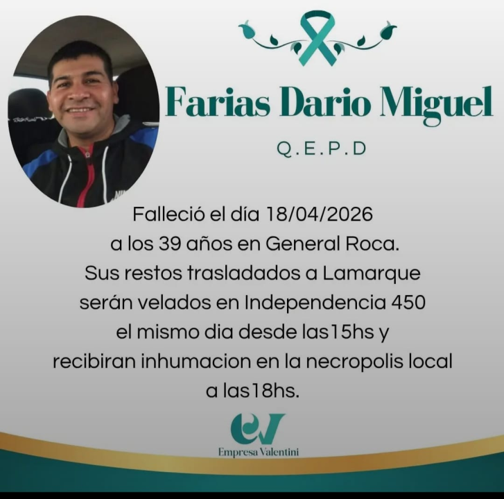 Este sábado, el cuerpo fue trasladado nuevamente a Lamarque, donde familiares y allegados lo velan en medio de una profunda conmoción.