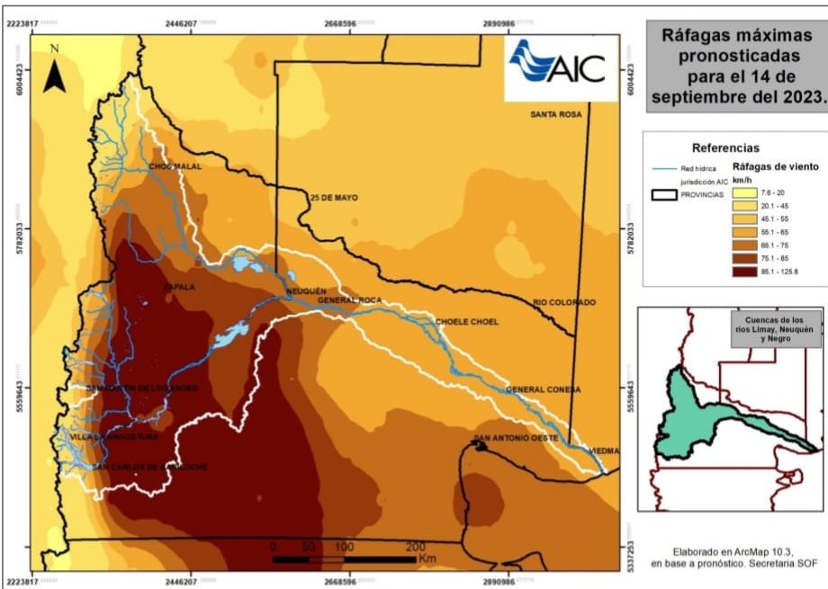 El meteorólogo de la AIC, Fernando Frasetto, explicó que “estamos teniendo sobre todo lo que es la zona de El Bolsón, Bariloche, y toda el área de Nahuel Huapi el ingreso de un sistema frontal con característica de río atmosférico. Esto significa un transporte de vapor de agua intenso que concentra precipitaciones en superficie y en altura también (en montaña) persistentes e intensas. Se han registrado lluvias de 100, 200 y hasta casi 300 milímetros» entre el jueves y viernes en la cuenca del río Limay.