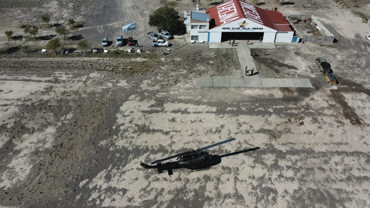 Fuentes del Aeroclub Regina explicaron a Diario RÍO NEGRO que fue un Bell UH1H que pertenece a la Sección de Aviación del Ejército de Montaña 6. Aterrizó a las 9:45.