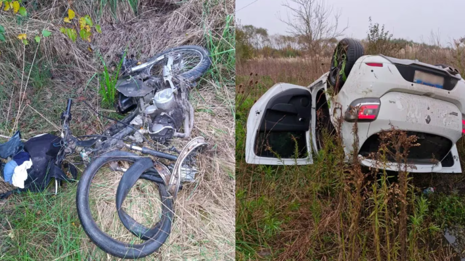 Producto del fuerte impacto, la moto quedó destrozada por completo y su conductora murió por las heridas recibidas. Por su parte el auto volcó y terminó en la vera de la ruta.