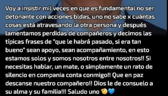 Una de las principales publicaciones despidiendo al policía manifestó: «Voy a insistir mil veces en que es fundamental no ser detonante con acciones, uno no sabe por cuántas cosas está atravesando la otra persona y después lamentamos perdidas de compañeros«. «Sean apoyo, sean acompañamiento, en esto estamos solos y somos nosotros entre nosotros», agregó.
