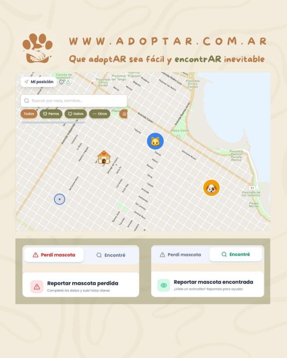 La plataforma permite publicar animales en adopción, pero también incluye una sección específica para mascotas perdidas o encontradas, «EncontrAR». “El sistema lo que hace es generar una especie de ADN digital a partir de fotos. Después compara esas imágenes con otras publicaciones dentro de un radio determinado”, explica Vidal Adduc.