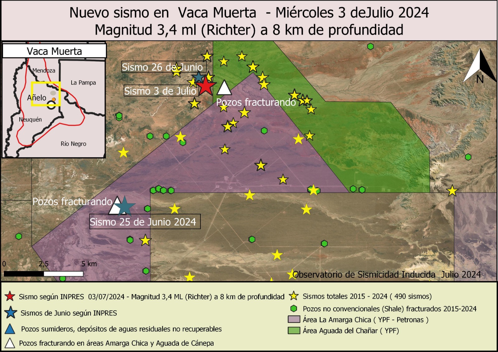 En total, fueron 13 los sismos en la provincia de Neuquén en el mes de junio, todos ellos asociados al fracking. Suman 43 los sismos totales ocurridos en la provincia de Neuquén durante 2024, 33 de ellos asociados al fracking y solo 10 producidos naturalmente.