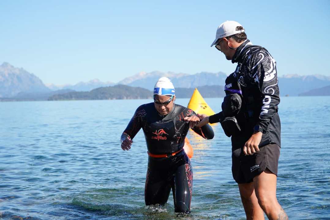 Junto a Gustavo nadaron otros 34 competidores que salieron en grupos desde la costa opuesta del lago y la mejor marca la hizo una local: Mayte Puca, una nadadora profesional de aguas abiertas que también tuvo su propio desafío porque debutó en el cruce del lago que la vio crecer.