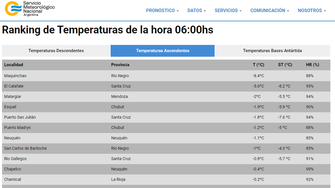 Hoy Maquinchao lidera el ranking de las ciudades más frías del país. Conocé el detalle del pronóstico para los próximos días.