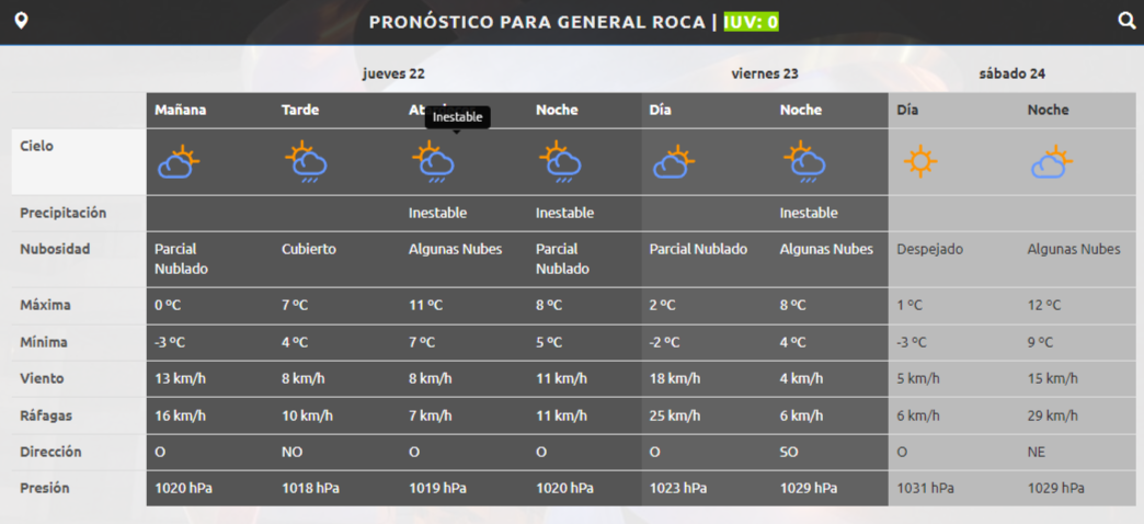 Según la Autoridad Interjurisdiccional de Cuencas (AIC), en Roca este jueves las temperaturas oscilarán entre los -3° C y los 11° C. Por la tarde podría haber lluvias por lo que el cielo estará parcialmente nublado.