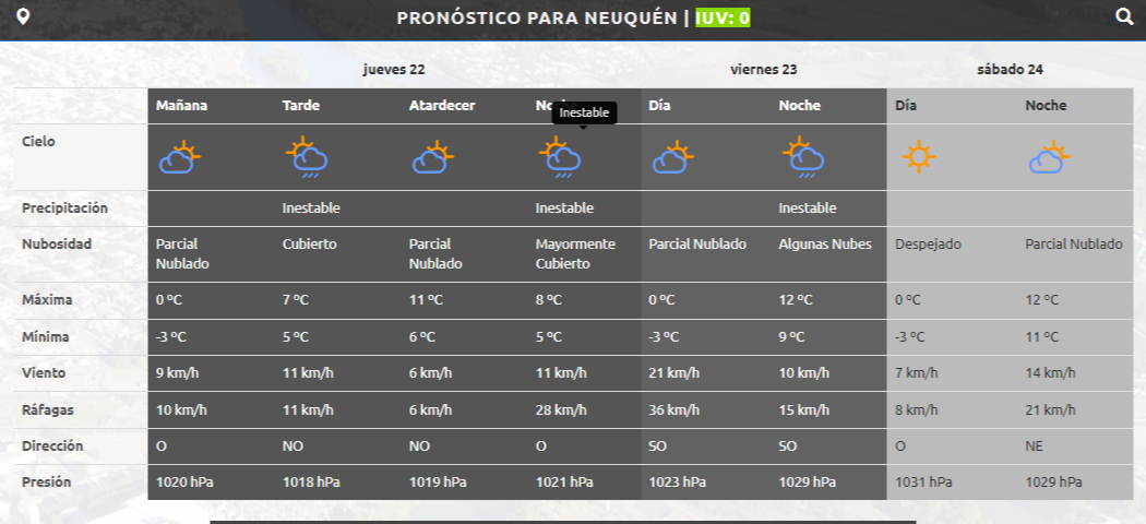 Según la Autoridad Interjurisdiccional de Cuencas (AIC), para este jueves en Neuquén capital se espera una jornada inestable, con posibles precipitaciones durante la tarde. La temperatura llegarán a una máxima de 11° C y una mínima de -3° C.