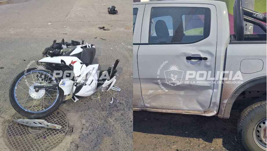 Un fuerte choque se produjo este miércoles por la mañana en la esquina de Lago Viedma y Los Horneros de Neuquén. El impacto fue protagonizado por una camioneta Ford Ranger y una moto Honda 110, cuya conductora fue trasladada al hospital Heller con lesiones en sus piernas y cadera.