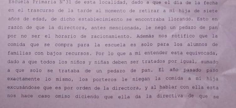 Fue en ese punto que la madre decidió hacer la denuncia en la comisaría y difundir el hecho, porque, indicó, ya había vivido algo similar el año pasado. Puntualizó que cuando le reclamó a la directora en ese momento, ella le respondió «que no alcanzaba la plata que mandaban para darle a todos los chicos cada vez que iban a pedir pan«.