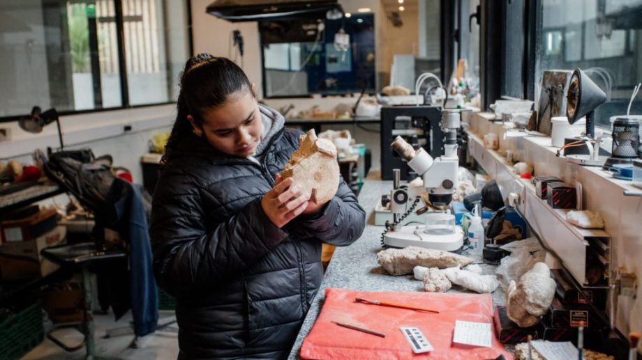 Victoria, junto a su familia, visitaron el lugar en el que se encuentra el fósil por estas horas, donde es estudiado por antropólogos del museo y donde quedó registrado el hallazgo, y conversó con el equipo profesional conformado por Victoria Sarasa, Matias Taglioretti y Fernando Scaglia.