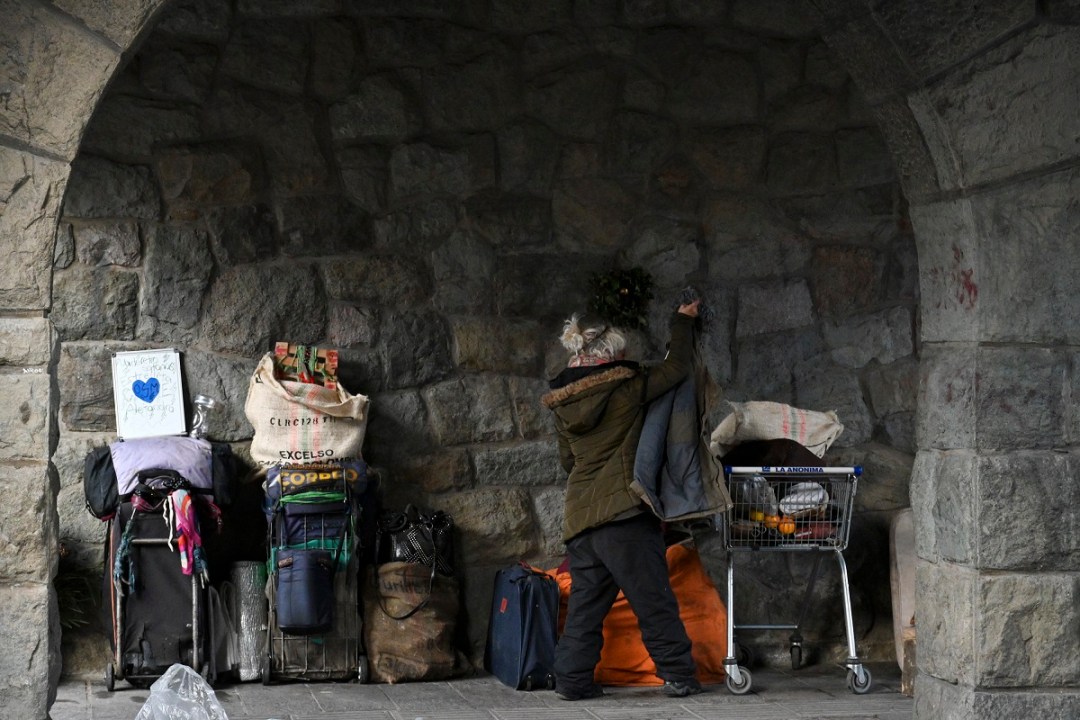 La mujer barre y acomoda unos objetos como si fuera el living de su casa. Traslada unas maderas de un lugar a otro, entre valijas, bolsos y un chango de supermercado. La escena ocurre en los arcos del Centro Cívico de bariloche, donde una pareja de artesanos duerme, desde hace ya varias semanas.