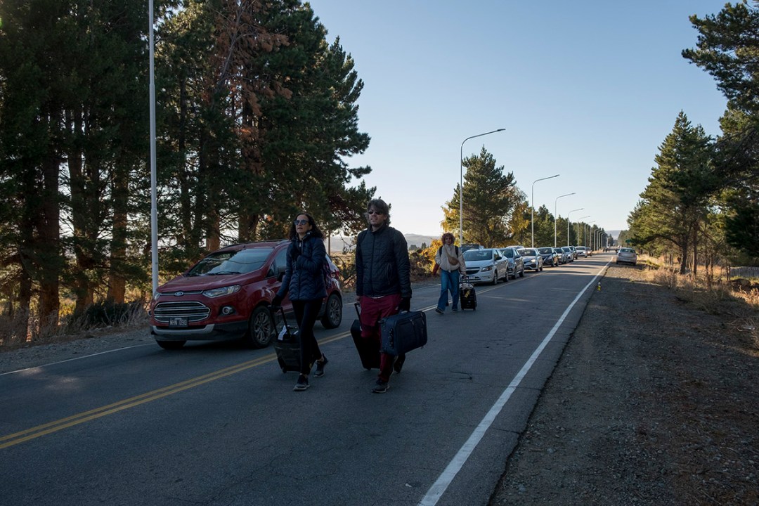 Decenas de turistas caminaban a paso rápido con valijas y bolsos por la ruta del aeropuerto de Bariloche en la fría mañana del viernes mientras bordeaban unos 70 taxis y remises que bloqueaban el camino. Algunos lograban que algún transporte los recogiera unos kilómetros más adelante; otros debieron transitar los 5 kilómetros de la ruta sin éxito. El reclamo duró dos horas.