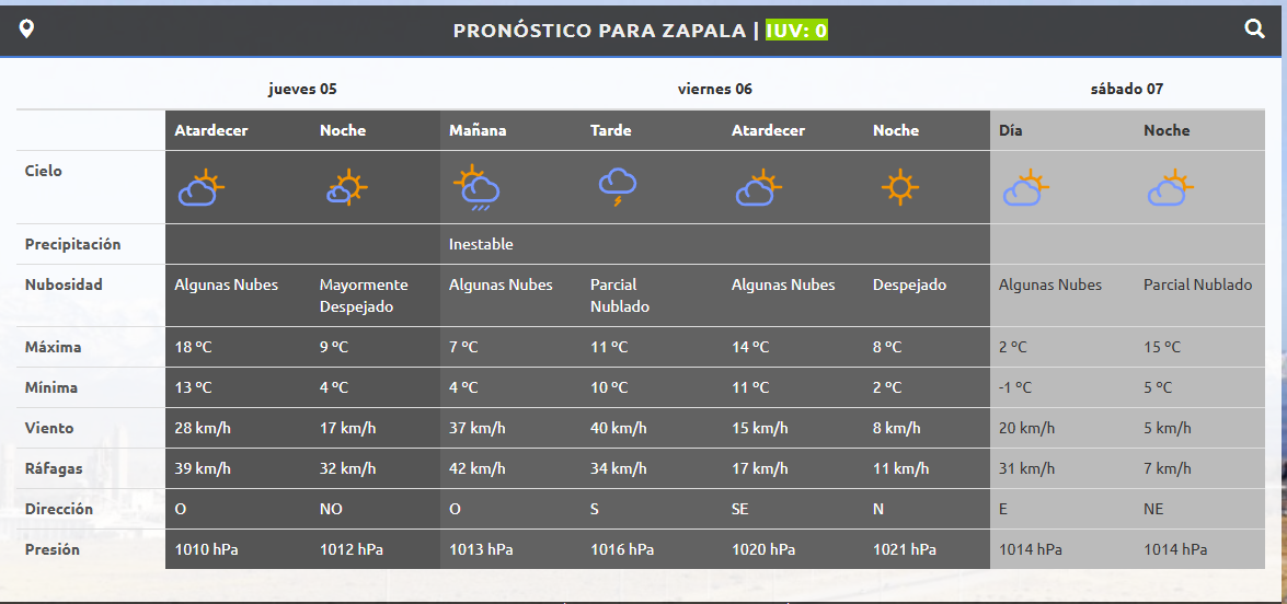 En la zona de Zapala y localidades cercanas, la AIC indica una jornada inestable con probabilidad de tormentas eléctricas para el viernes.