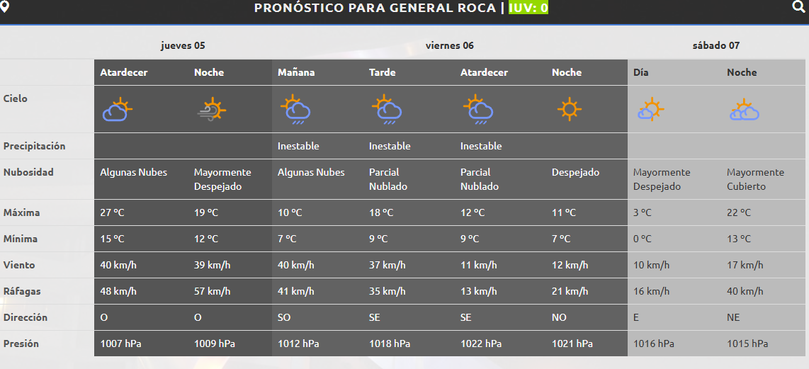 Según indica la AIC, en la zona del Alto Valle se vivirá también una jornada inestable el viernes. Las lluvias se harán sentir con fuerza por la mañana y se espera que se mantenga durante todo el día. El viento estará presente con ráfagas que alcanzarán los 41 km/h.