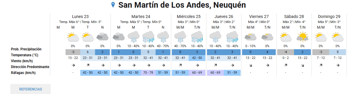En San Martín de los Andes y alrededores, se esperan precipitaciones y nieve a partir de este martes. Al igual que en Bariloche se mantendrán hasta el jueves con temperaturas entre los -3°C y los 5°C.