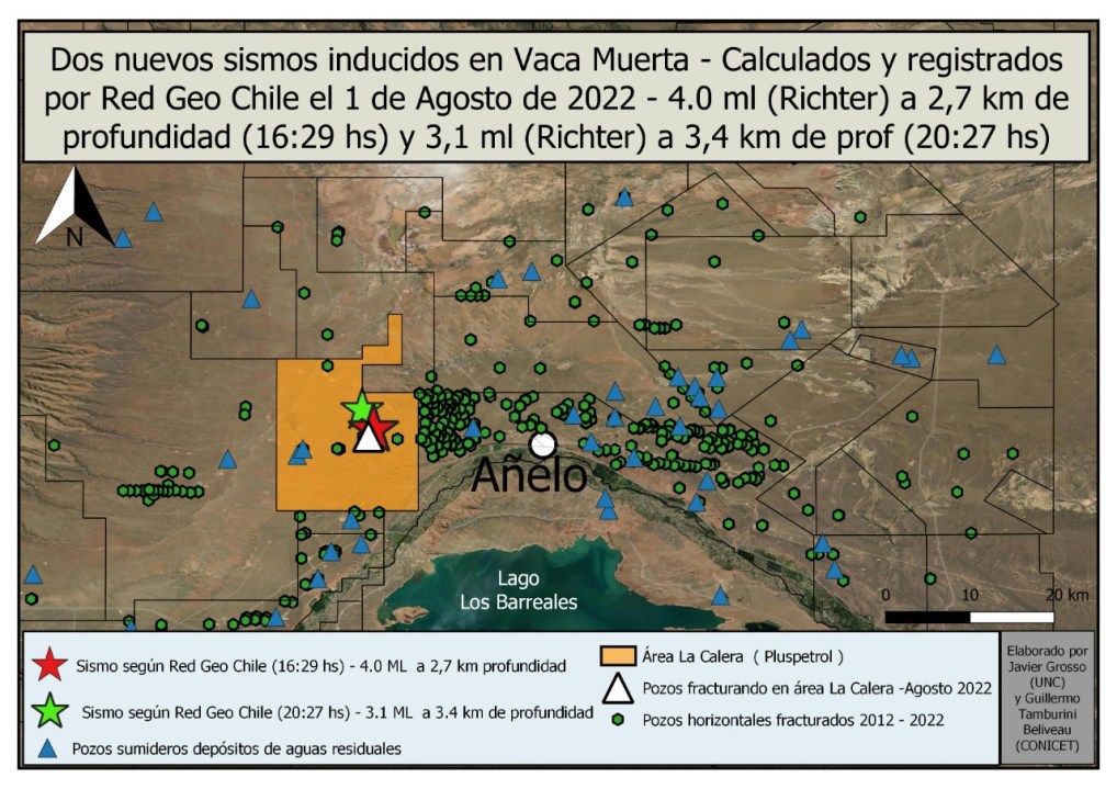 Según informó la Red Geocientífica de Chile, el primero fue minutos después de las 16. Tuvo su epicentro a 17 kilómetros al oeste de Añelo y fue de magnitud 4.0. Se registró a 3 kilómetros de profundidad.