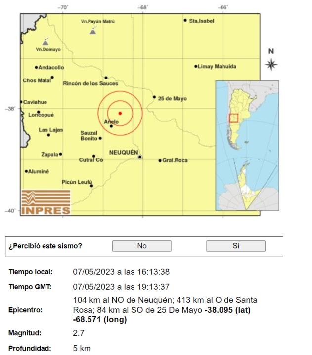 Según informó el Instituto Nacional de Prevención Sísmica (Inpres) fue de 2,7 Ml (Richter), y ocurrió a 5 kilómetros de profundidad.
