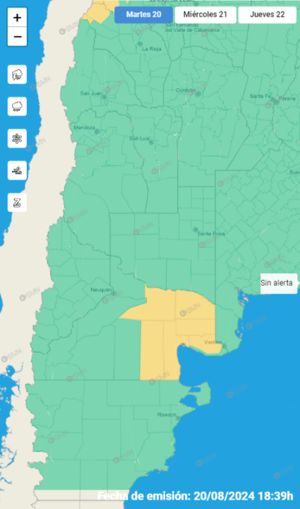 Según informó el SMN, para el centro-este de la provincia se esperan lluvias persistentes con intensidad variada y con valores de precipitación acumulada entre 10 y 20 mm. Rige para esta noche y la madrugada del miércoles.