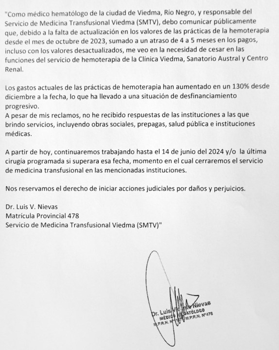 El profesional anunció que «continuaremos trabajando hasta el 14 de junio» o «la última cirugía programada si supera esa fecha» y después «cerraremos el servicio de medicina transfusional» en la Clínica Viedma, el Sanatorio Austral y el Centro Renal Viedma.