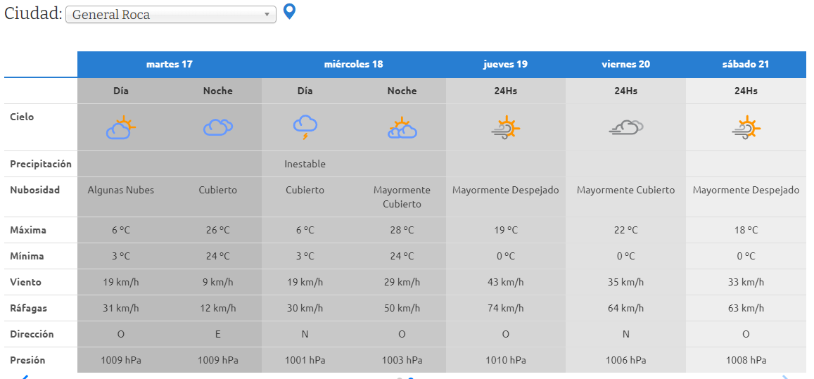 Según el pronóstico de la AIC, los peores días para Roca serán el miércoles, jueves y el viernes.