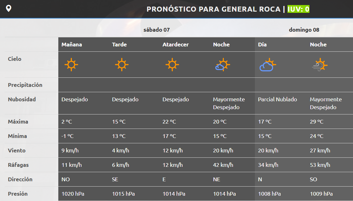 El domingo, las ráfagas en el Alto Valle alcanzarán los 60km/h. Estará parcial nublado y despejado. No hay probabilidad de lluvias.