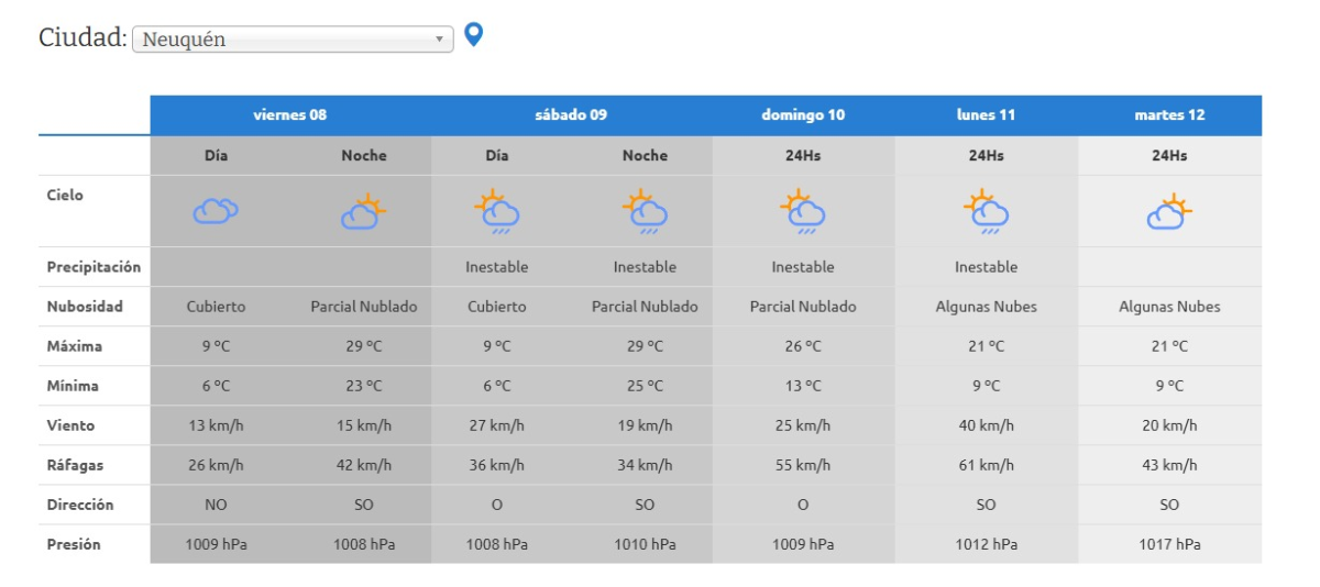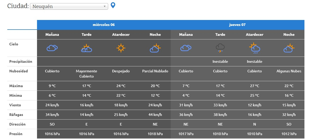 En Neuquén, durante este miércoles y jueves, el cielo estará cubierto la mayor parte del tiempo. Las temperaturas variarán con máximas en el orden de los 24°C para el miércoles y los 27°C para el jueves con probabilidad de lluvia. Las ráfagas alcanzarán los 44 km/h, especialmente el miércoles por la noche.
