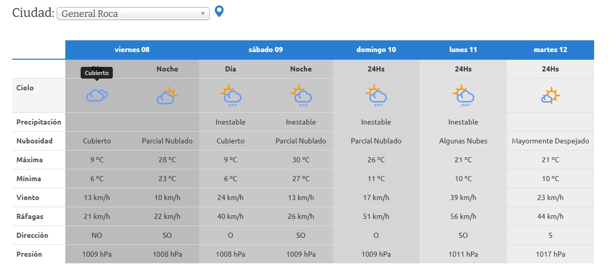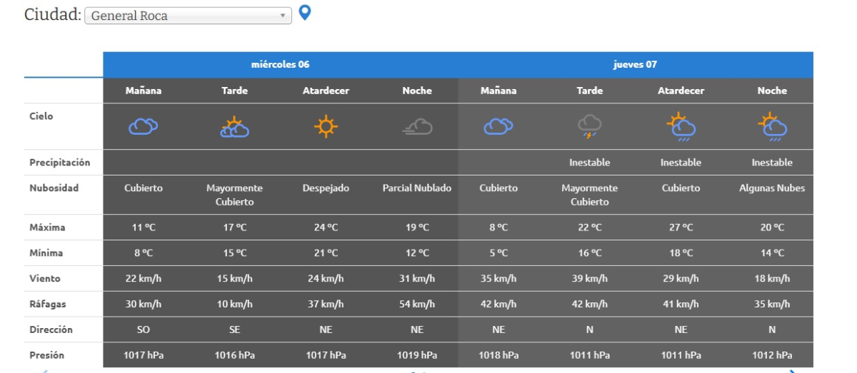 El clima en el Alto Valle de Río Negro, Roca, se presentarán con condiciones inestables y ráfagas de viento intensas. Durante este miércoles, el cielo estará mayormente cubierto en la tarde. Se prevé una temperatura máxima de 24°C. Las ráfagas llegarán a 54 km/h por la noche.