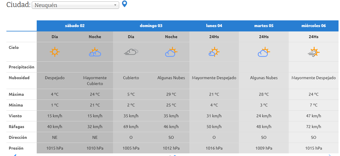En la ciudad de Neuquén, se espera el sábado una máxima de 24 °C y el domingo alcanzará los 29 °C. Las ráfagas serán de casi 70 km/h. De igual en modo, en Roca, se pronosticó jornadas ventosas el fin de semana con una máxima de 30°C este domingo 3 de noviembre.