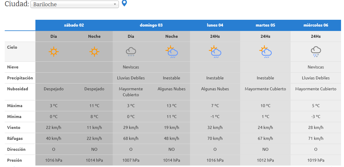 En Bariloche, se esperan neviscas y lluvias débiles durante el domingo. Además jornadas con frio con una mínima de 0°C y una máxima de 13°C.