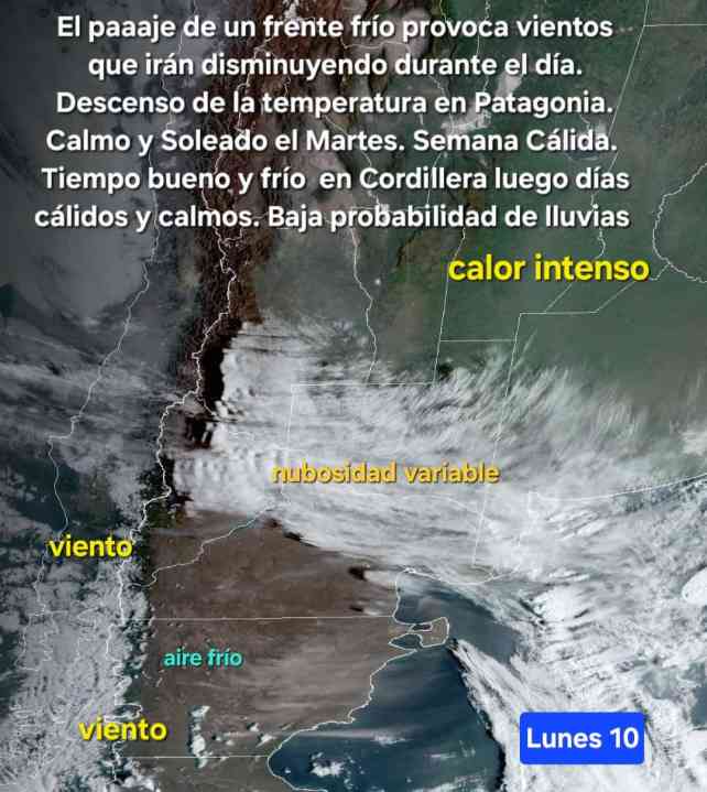 La Autoridad Interjurisdiccional de Cuencas (AIC) indica que el «pasaje de un frente frío provoca vientos que irán disminuyendo durante el día». Agrega que se espera el «descenso de la temperatura en Patagonia».