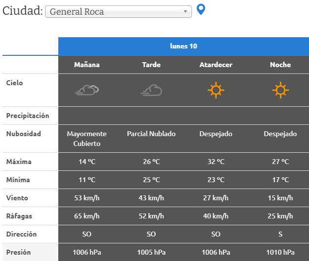 En Roca también se anuncia viento fuerte para este lunes. Las ráfagas más fuertes se prevén en la mañana: según la AIC, alcanzarán los 65 kilómetros por hora, aunque el SMN informa que podrían llegar a los 80 kilómetros por hora.