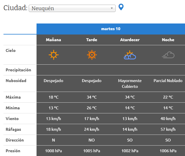Este martes, en Neuquén se espera una temperatura máxima de 34°C con una mínima de 13°C. Si bien, durante el día estará despejado, es probable que por la noche el cielo esté parcialmente nublado.