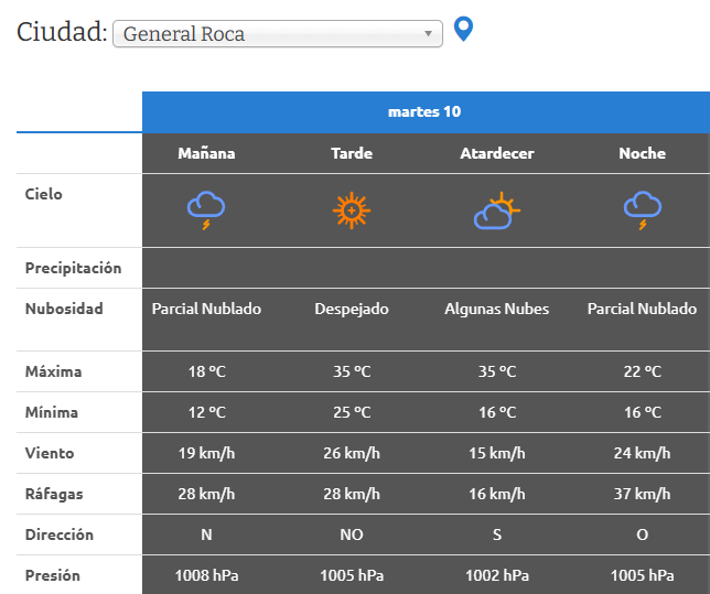 A diferencia de Neuquén y Cipolletti, en la ciudad de Roca se esperan posibles tormentas eléctricas por la tarde/noche. Hay probabilidades de que duren hasta mañana miércoles 11 de diciembre.
