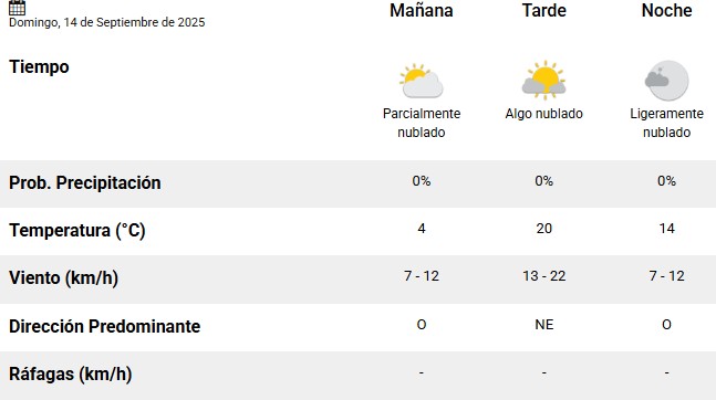 Este domingo 14 de septiembre habrá una jornada con buenas condiciones del tiempo en el Alto Valle de Río Negro y Neuquén. Según informó el pronóstico del Servicio Meteorológico Nacional (SMN) el viento será breve y estará parcialmente nublado.