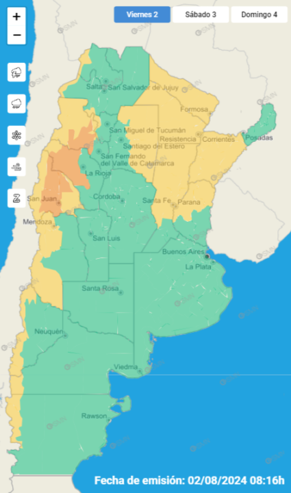 El SMN comunicó que hay este viernes un alerta amarillo y naranja por viento zonda en Mendoza, San Juan, La Rioja, Santiago del Estero y Tucumán. «Con intensidades entre 50 y 65 km/h y ráfagas que pueden alcanzar los 90 km/h, pudiendo ser superados localmente. Este fenómeno puede provocar reducción significativa de la visibilidad, un repentino aumento de temperaturas y condiciones de muy baja humedad relativa», indicó el organismo nacional.