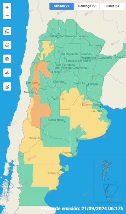Hacia el norte, en San Juan, las zonas alcanzadas por la alerta naranja son: Precordillera de Calingasta – Precordillera de Pocito – Precordillera de Rivadavia – Precordillera de Sarmiento – Ullum – Zonda – Precordillera de Iglesia – Precordillera de Jáchal – Precordillera de Coronel Felipe Varela – Precordillera de General Lamadrid.
