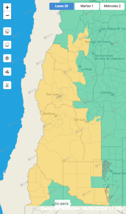 El lunes cierra con alertas del Servicio Meteorológico Nacional (SMN) en Neuquén y Mendoza.