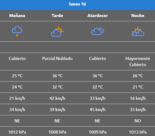 Para la tarde, la nubosidad será variable, con períodos de cielo cubierto y algunas nubes, alcanzando una máxima de 36 ºC, continuará la probabilidad de tormenta con rafagas de viento que alcanzarán los 42 km/h.