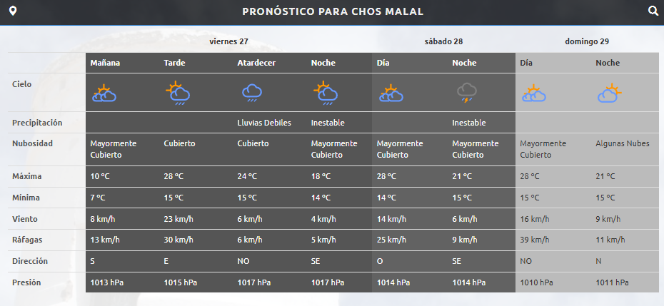 En Chos Malal y zonas aledañas, el viernes será un poco más fresco con máximas de hasta 28°C. En este sector también habrá lluvias débiles.